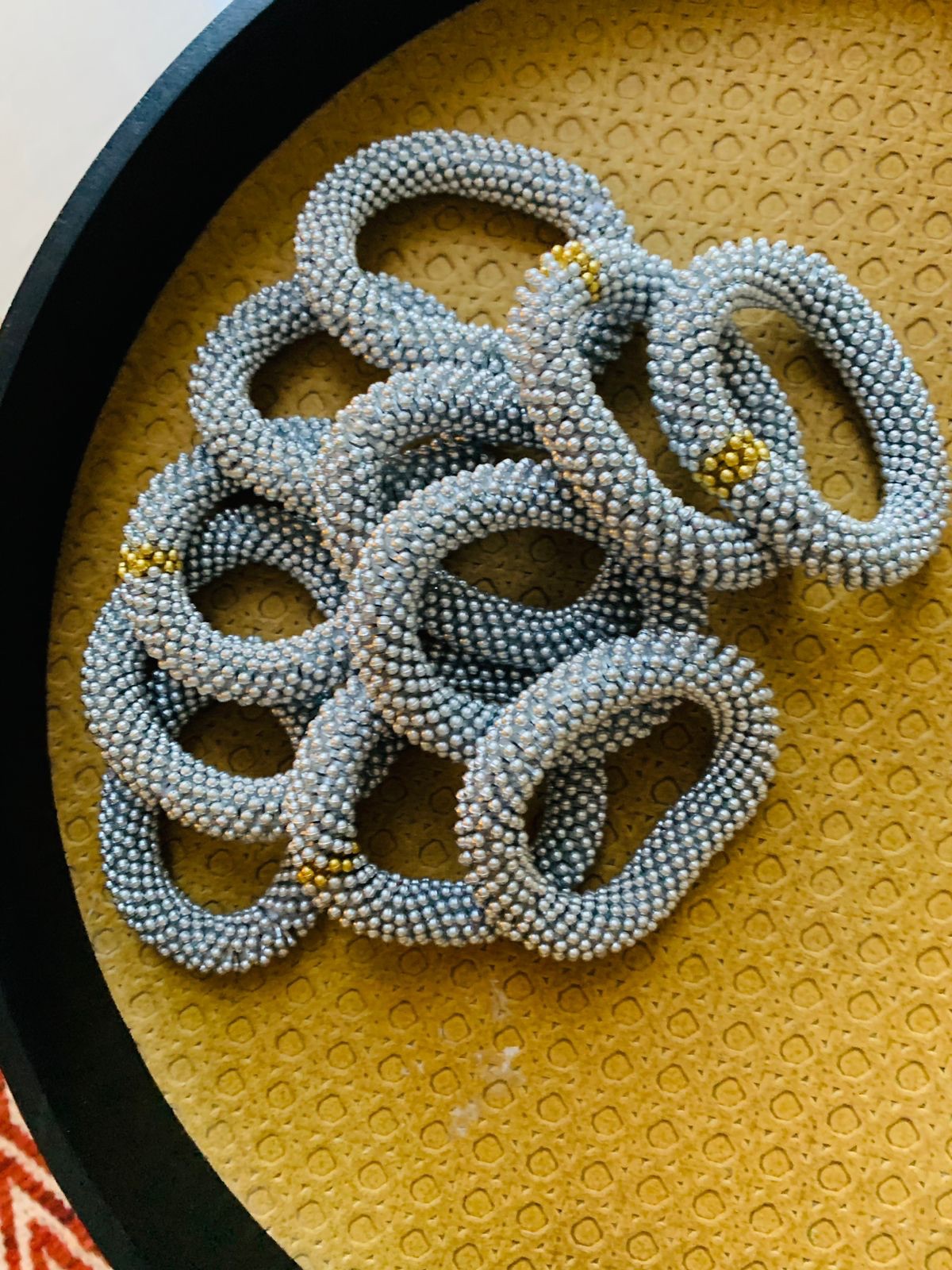 Beautiful arm beads available in various colors and designs. Can be crafted in beads or other materials to suit your preference.